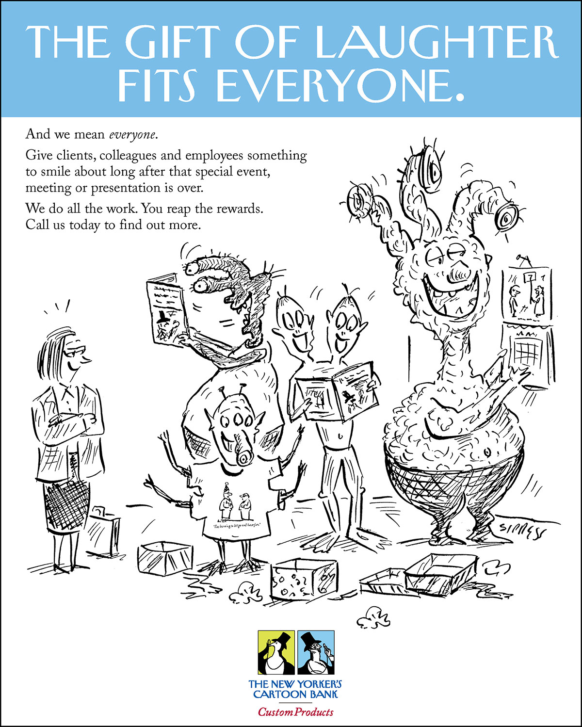 Sales promotion for corporate gifts: Choose cartoons from our vast library (accountant cartoons, lawyer cartoons, mom cartoons) or commission an original or three. The New Yorker staff will craft a unique gift book, diary, or calendar. Isn’t that smarter than giving another basket of cheese and crackers?