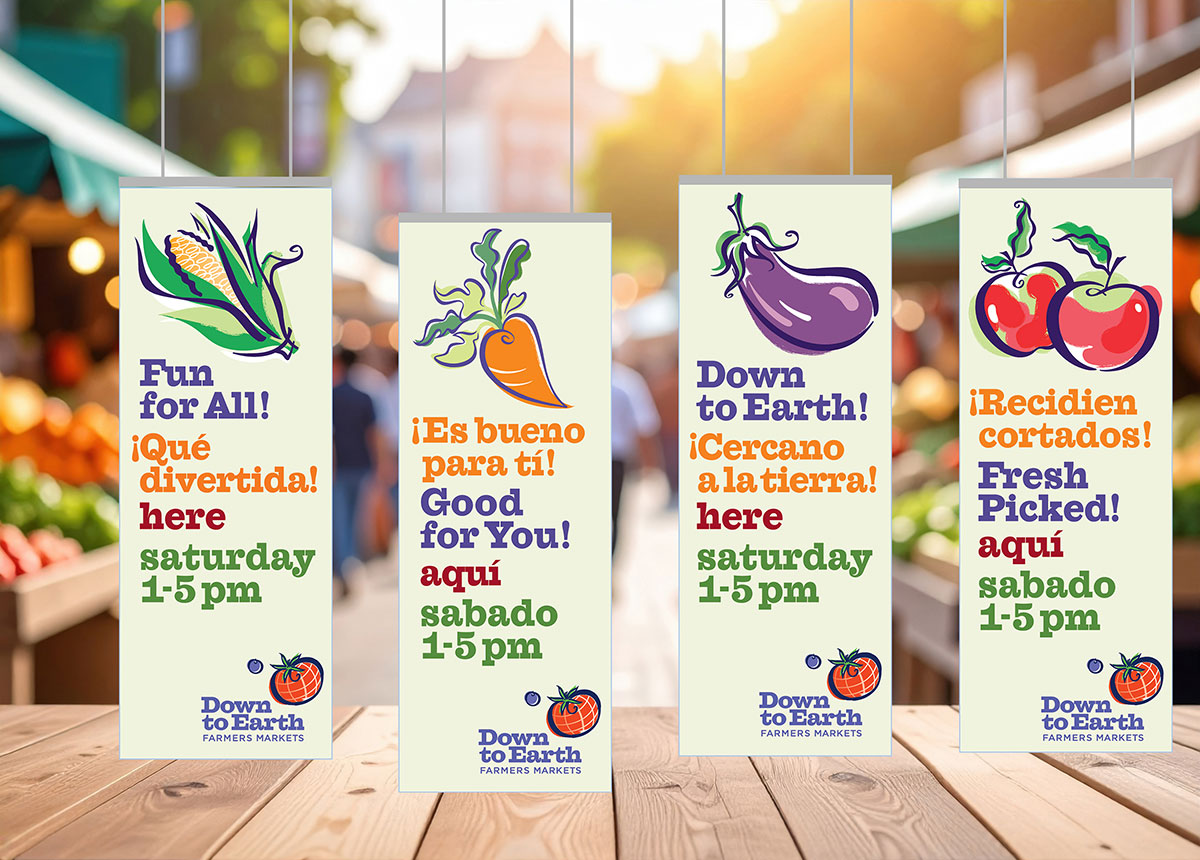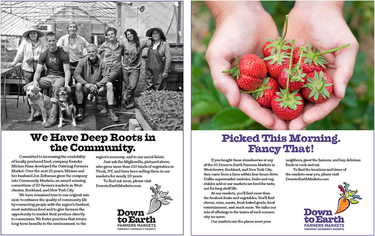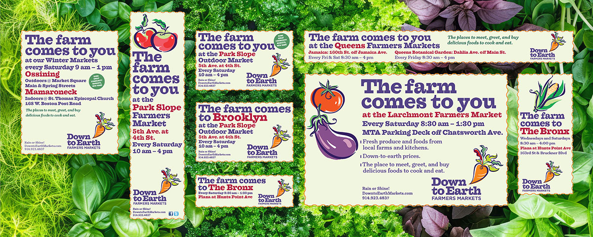 We developed ads to re-introduce newly re-branded Down to Earth Markets and communicate with local citizens and government officials (who give zoning permits to farmers markets) and why it’s important to patronize them. Down to Earth’s restated mission: “to ensure a future for small-scale agriculture and food production in the New York area by creating vibrant marketplaces where community thrives and shoppers connect directly to the local food system.”