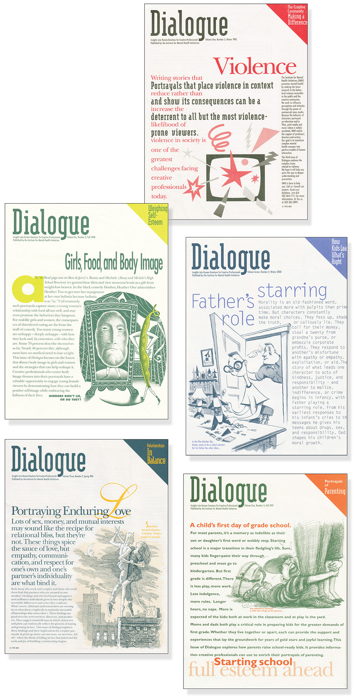 The campaign began with violence, but IMHI also focused on issues that were often portrayed with a lack of sensitivity, including fear, risk-taking, hate, loss, sex, parenting, and aging. Dialogue, a four-page, two-color quarterly, quickly attracted an advisory board of leaders in the media and had a circulation of 20,000. “Our goal,” IMHI’s editors wrote, “is to transform complex mental health concepts into positive models of human interaction.”